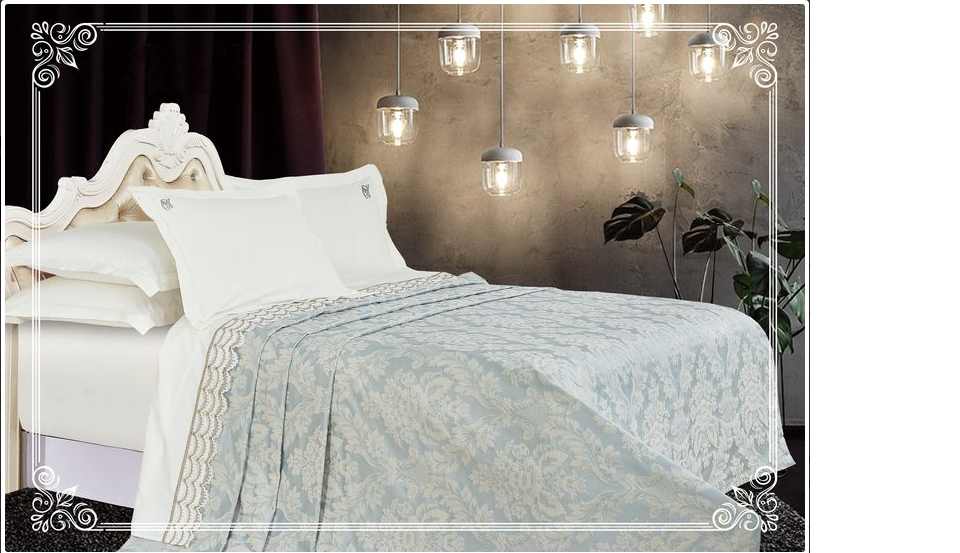 Коллекция Флоэрино для любителей вечной Классики. Представлена комплектом постельного белья и покрывалом в трех цветах: белом, молочном и лазурном. Постельное белье из высококачественного сатина с отворотом на пододеяльнике изящно накрывающим покрывало, позволяет укрываться им в теплое время года. Отворот с отделкой венецианским широким кружевом подчеркивает рисунок на покрывале. Наволочки 50х70 дополнены изящной буквой К из качественных страз. Покрывало и наволочки 70х70 выполнены из жаккардовой хлопковой ткани со стильным классическим орнаментом, с отделкой алмазным краем, что подчеркивает изящное убранство спальни. Комплектация – покрывало 240х260 к ним наволочки 70х70, пододеяльник 200х220+50см, наволочки 50х70 и 70х70, простынь 240х260см (1).  Комплекты изящно выложены в Брендовый двухъярусный чемодан "KAZANOV.A.". Низ и верх коробки с дизайнерской бумагой, использовали два модных в этом сезоне цвета - белый жемчуг и цвет Тиффани. Изящный бантик на крышке и логотип KAZANOV.A. светлым золотом добавляет изысканности и законченности коробке.