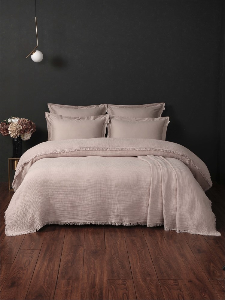 Коллекция Stonewash Muslin. Премиальный текстиль из натурального хлопка. Коллекция объединяет два хлопковых материала высочайшего качества — лёгкий многослойный муслин и шелковистый мако-сатин, идеально дополняющие друг друга. Это сочетание гарантирует безупречный комфорт сна и отдыха. Состав комплекта по материалам: Муслин-stonewashed. Летнее покрывало многослойный муслин (100% хлопок, умягчённый и сжатый по технике stonewashed). Изящная фестонная отделка по краю покрывала добавляет актуальную богемную нотку. Мако-сатин-AirJet - 100% хлопковый шелк, благородная матовая текстура и тактильное удовольствие: • Простыня, • Наволочки с отделкой декоративным ушком (+5 см). Комплектации: Евро: покрывало 200х230 см; простыня 230х250 см; наволочки 50х70 см (2 шт); 70х70 см (2 шт). Семейный: покрывала 150?200 см (2 шт); простыня 230?250 см; наволочки 50?70 см (2 шт); 70?70 см (2 шт). Упаковка: Каждый комплект упакован в дизайнерскую коробку от бренда KAZANOV.A. - готовое решение для идеального подарка. Stonewash Muslin - элегантный дизайн, натуральные материалы и внимание к деталям – всё, чтобы ваш дом стал совершенным!
